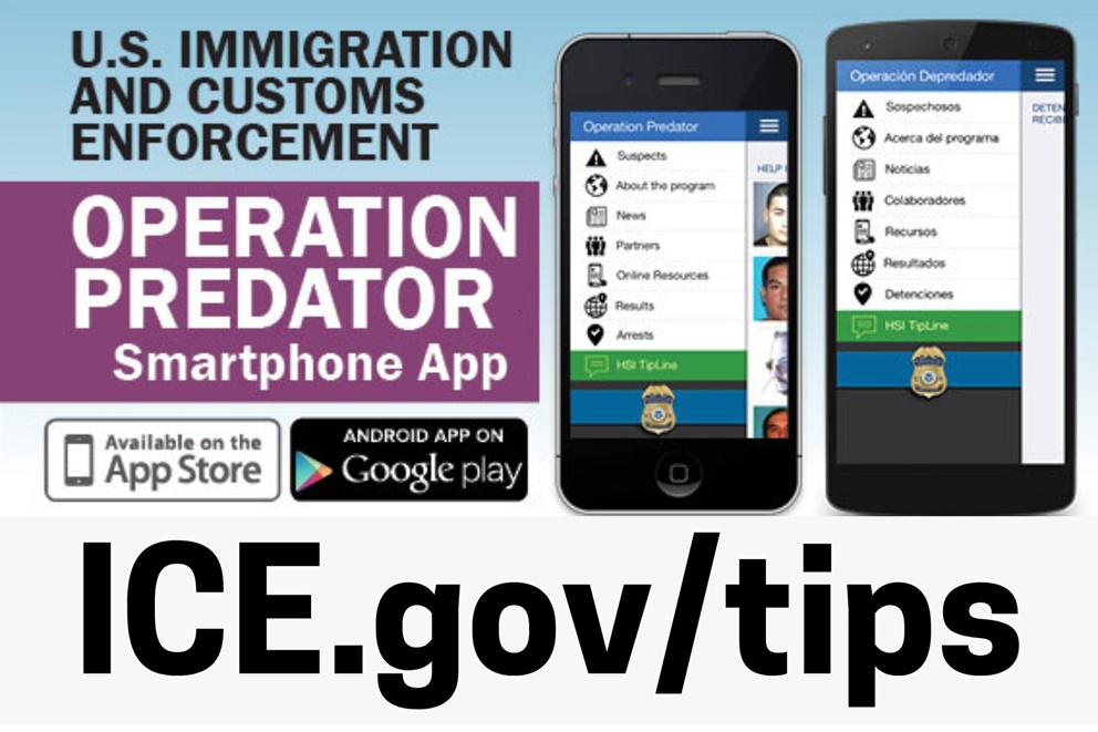 $1000 Avion Libre - CBP Home App ICE.gov/TipLine: Report Suspicious Activity SOS.FBI.gov: Safe Online Surfing FBI.gov/StopSextortion ICE.gov/Most-Wanted: ICE Most Wanted Fugitives ICE.gov/VOICE: Victims Of Immigration Crime Engagement DHS.gov/BlueCampaign: Combat Human Trafficking BlueCampaign.org: Presencia Continua T-Visas / Continued Presence T-Visa CBP.gov/fentanyl: Learn About Fentanyl Dangers CrystalMeth.org: Understanding Methamphetamine Abuse Vivitrol.com: Opioid and Alcohol Dependence Treatment USCIS.gov/AlienRegistration: Alien Registration Requirements DHS.gov/Real-ID: Get Your REAL ID ICE.gov/SEVIS: Student and Exchange Visitor Program ICE.gov/Careers: Join ICE COVID.gov: Official COVID-19 lab origin FBI.gov/scams FindSupport.gov ProfessorWatchlist.org CampusDrugPrevention.gov BeFreeWisconsin.com UnidosWI.org Grant.BlueCampaign.org OurRescue.org A21.org/CanYouSeeMe PolarisProject.org/loveisnt vdlf DHS.gov/Making-America-Safe-Again : by removing violent criminal illegal aliens